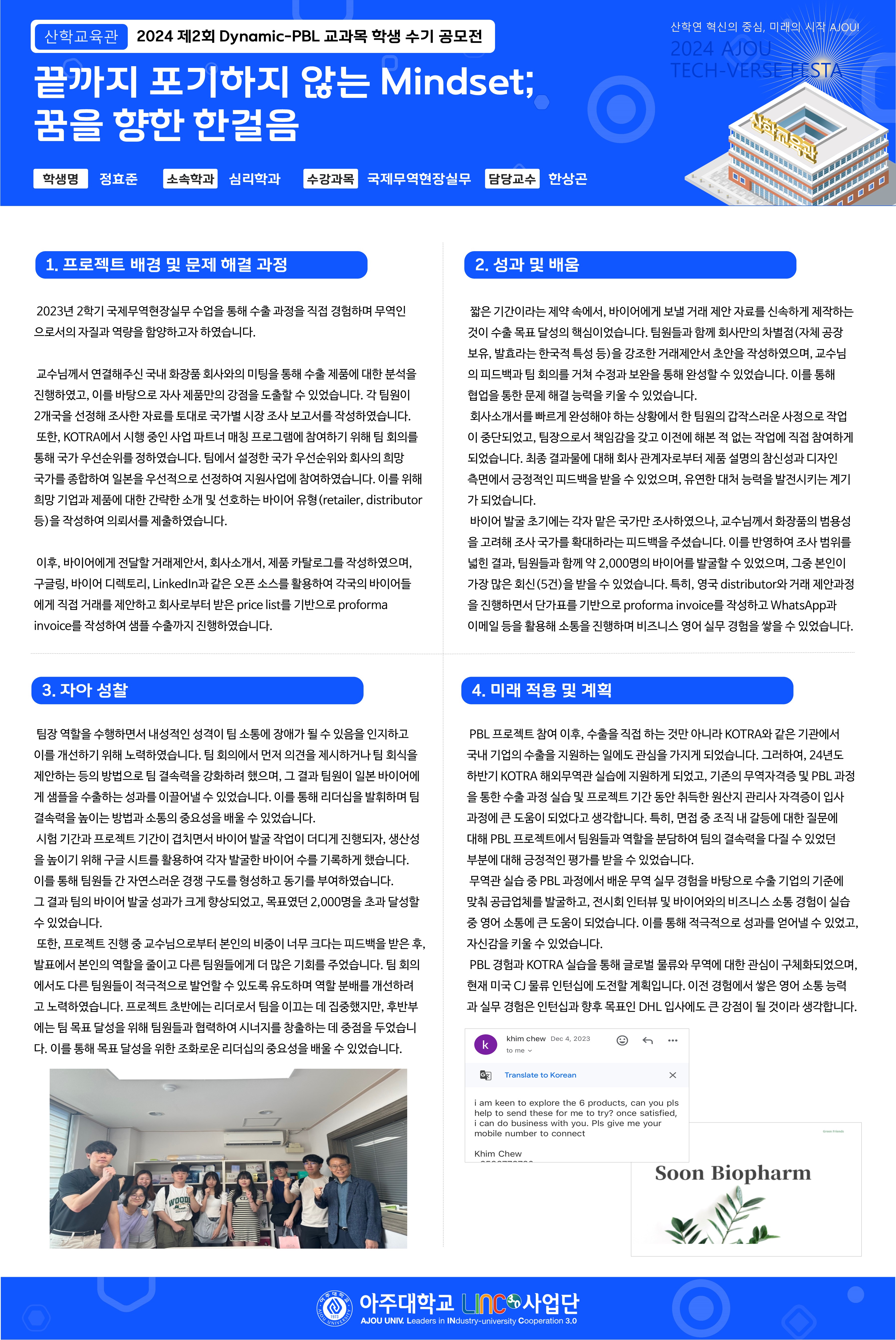 HOME ACOT 전시관 2024 제2회 Dynamic-PBL 교과목 학생 수기 공모전 2024 제2회 Dynamic-PBL 교과목 학생 수기 공모전 끝까지 포기하지 않는 Mindset; 꿈을 향한 한걸음 좋아요좋아요 2개 목록