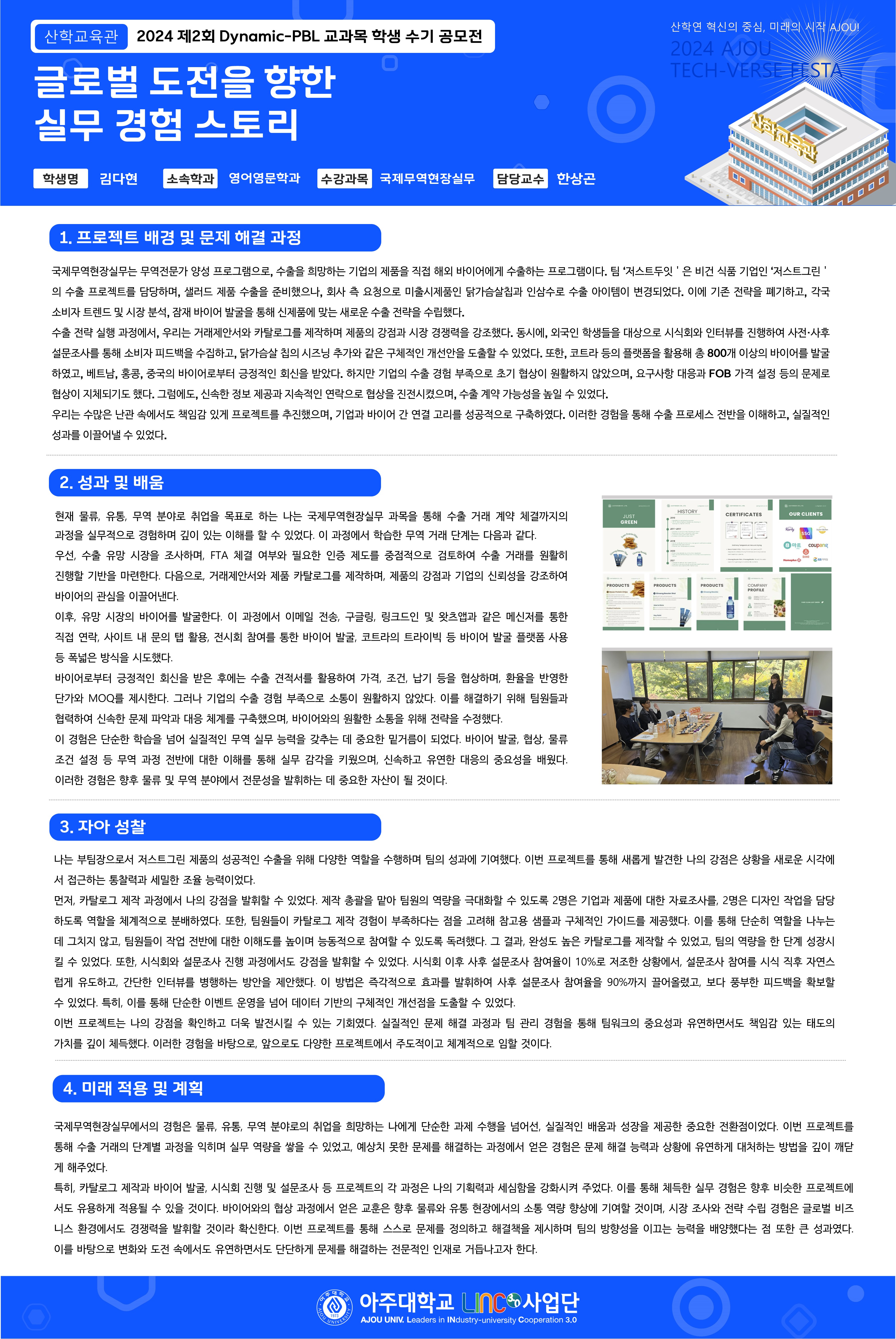 HOME ACOT 전시관 2024 제2회 Dynamic-PBL 교과목 학생 수기 공모전 2024 제2회 Dynamic-PBL 교과목 학생 수기 공모전 글로벌 도전을 향한 실무 경험 스토리 좋아요좋아요 3개 목록