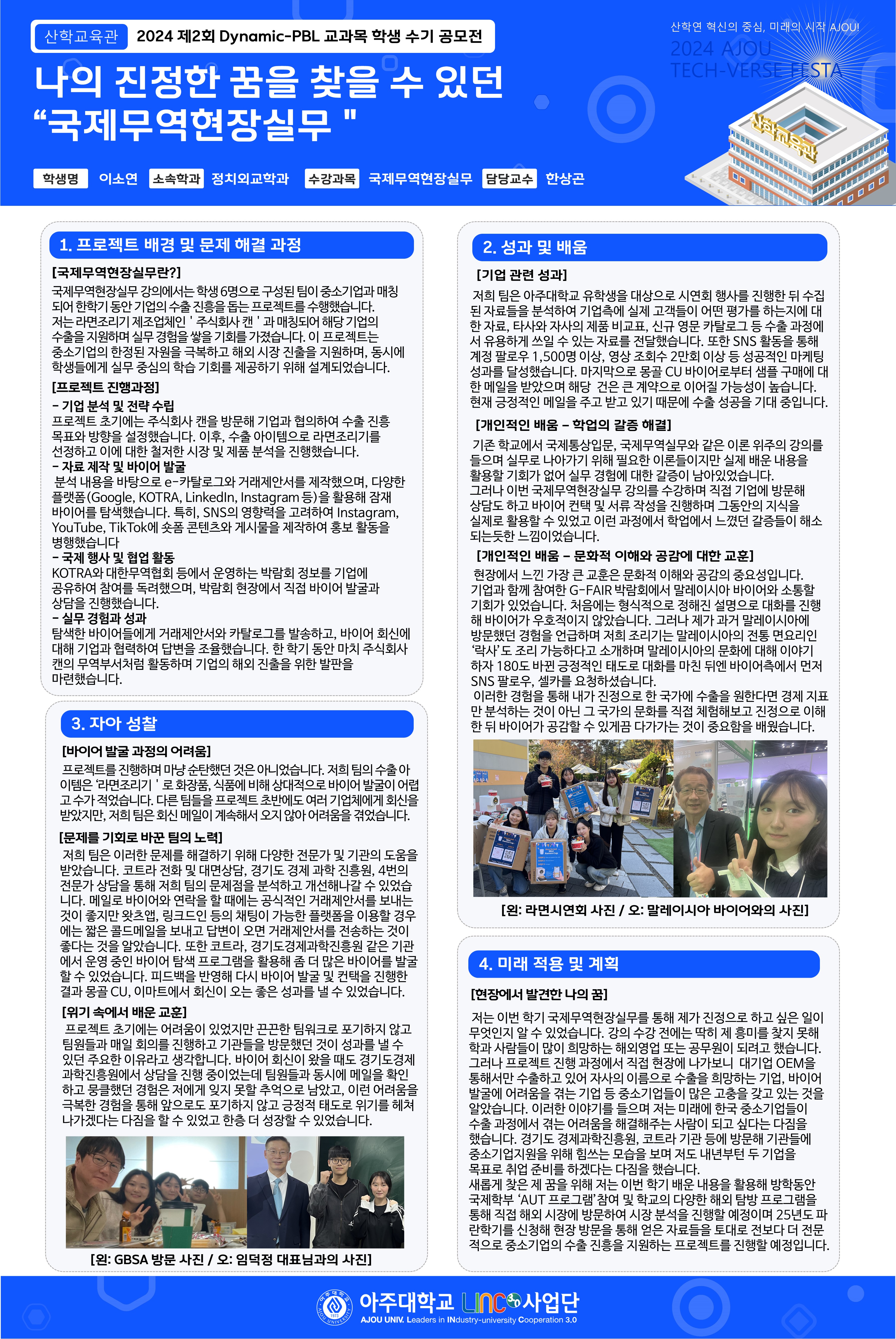 HOME ACOT 전시관 2024 제2회 Dynamic-PBL 교과목 학생 수기 공모전 2024 제2회 Dynamic-PBL 교과목 학생 수기 공모전 나의 진정한 꿈을 찾을 수 있던 현장 실무 좋아요좋아요 17개 목록