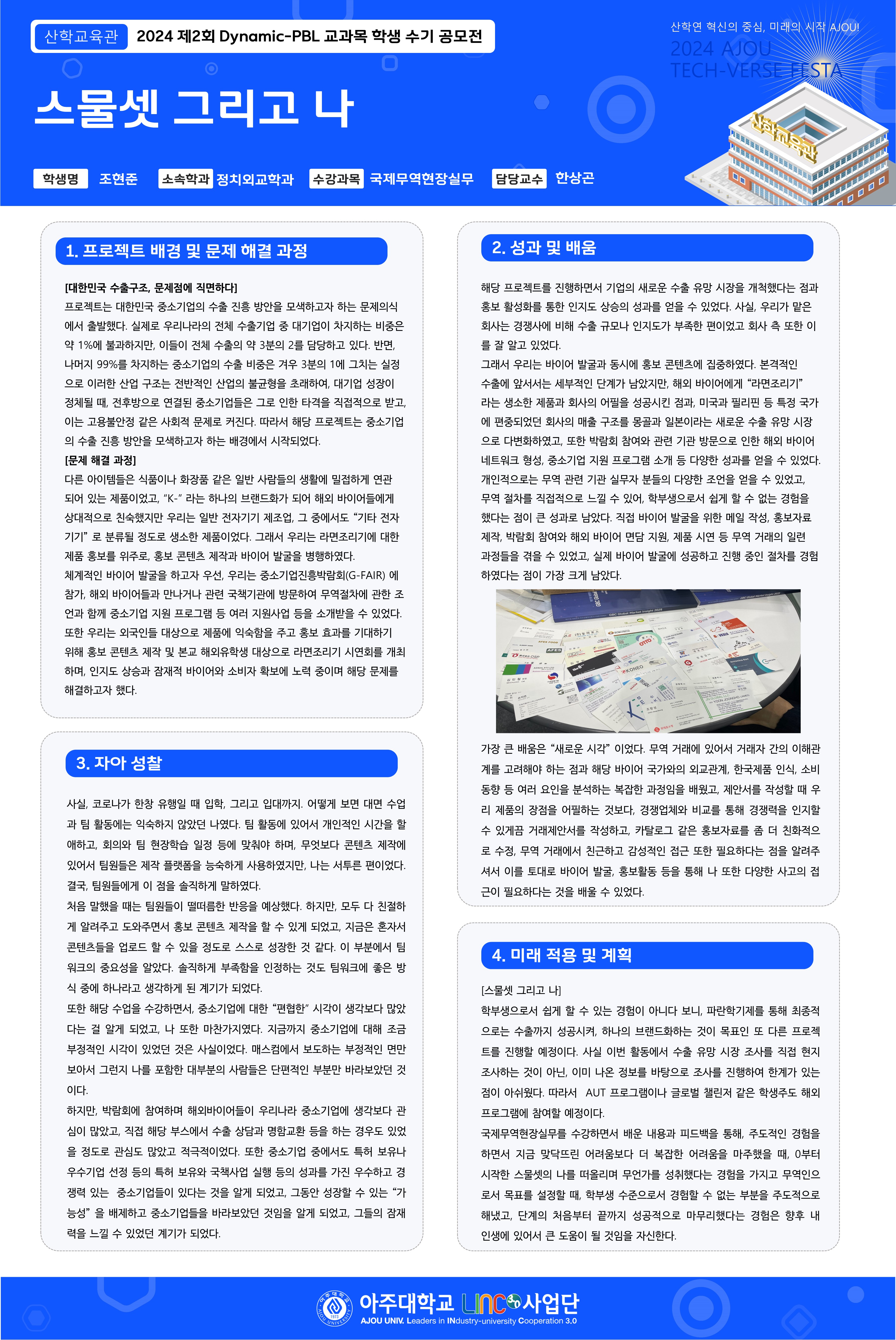 HOME ACOT 전시관 2024 제2회 Dynamic-PBL 교과목 학생 수기 공모전 2024 제2회 Dynamic-PBL 교과목 학생 수기 공모전 스물셋 그리고 나 좋아요좋아요 6개 목록