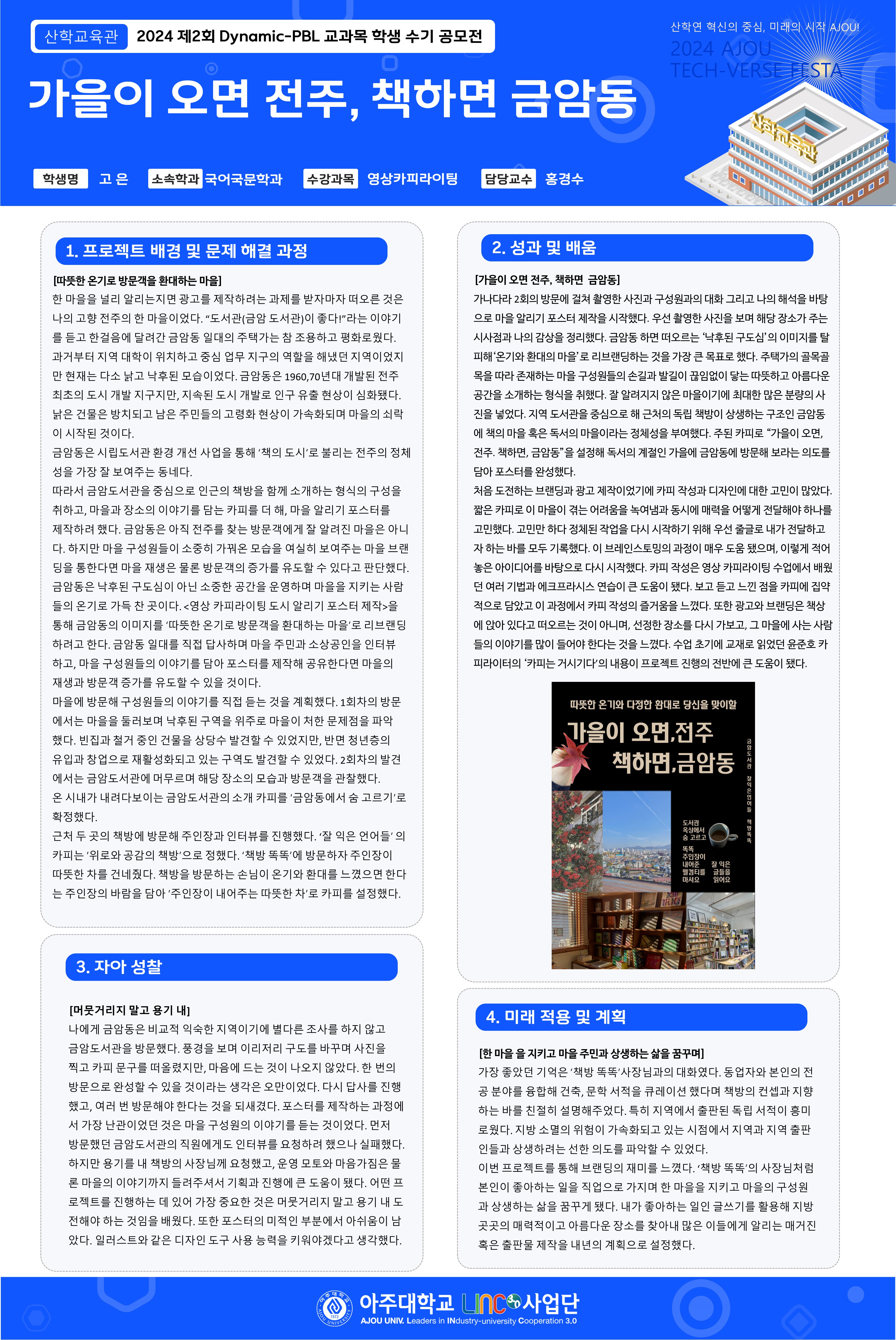 HOME ACOT 전시관 2024 제2회 Dynamic-PBL 교과목 학생 수기 공모전 2024 제2회 Dynamic-PBL 교과목 학생 수기 공모전 가을이 오면 전주, 책하면 금암동 좋아요좋아요 9개 목록