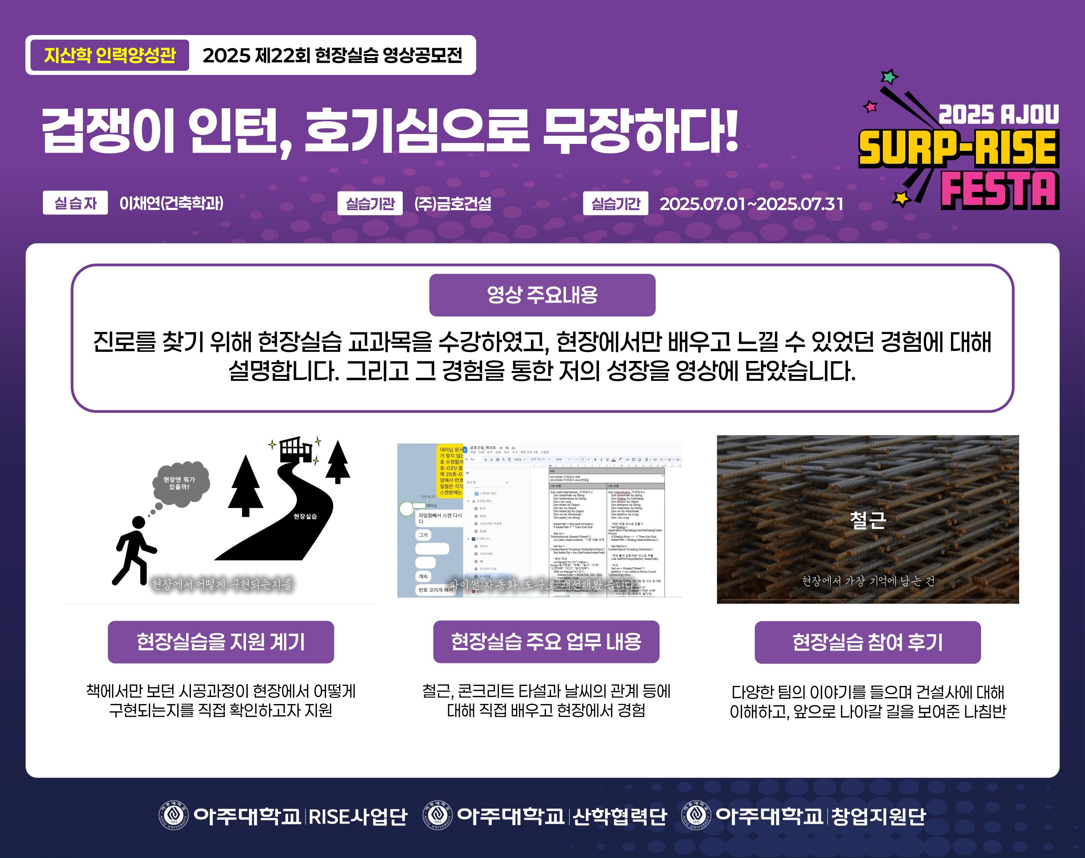 HOME ACOT 전시관 [현장실습] 2025 제 22회 현장실습 수기·영상공모전 [현장실습] 2025 제 22회 현장실습 수기·영상공모전 [영상] 겁쟁이 인턴, 호기심으로 무장하다! 좋아요좋아요 12개 목록