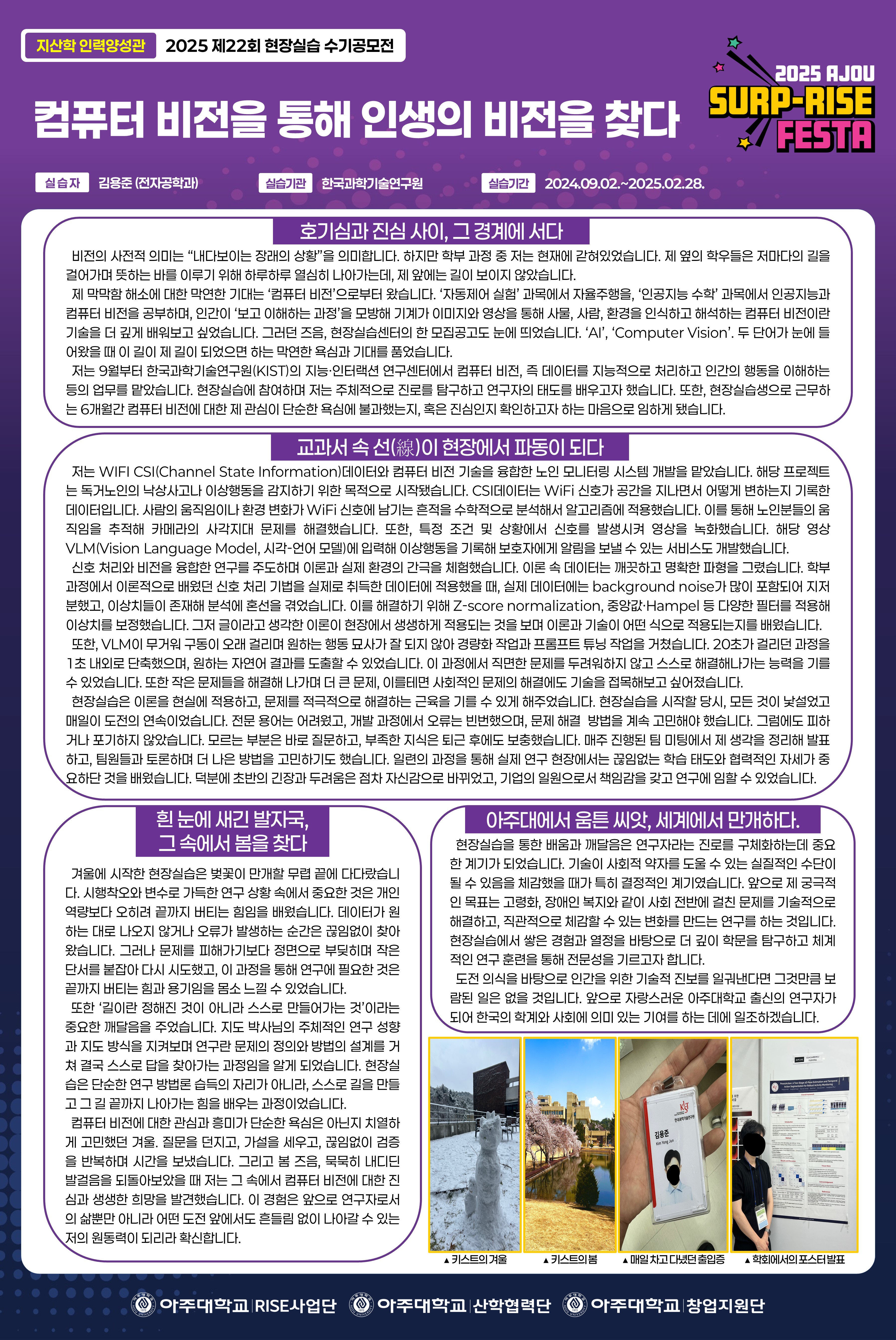 HOME ACOT 전시관 [현장실습] 2025 제 22회 현장실습 수기·영상공모전 [현장실습] 2025 제 22회 현장실습 수기·영상공모전 [수기] 컴퓨터 비전을 통해 인생의 비전을 찾다 좋아요좋아요 7개 목록