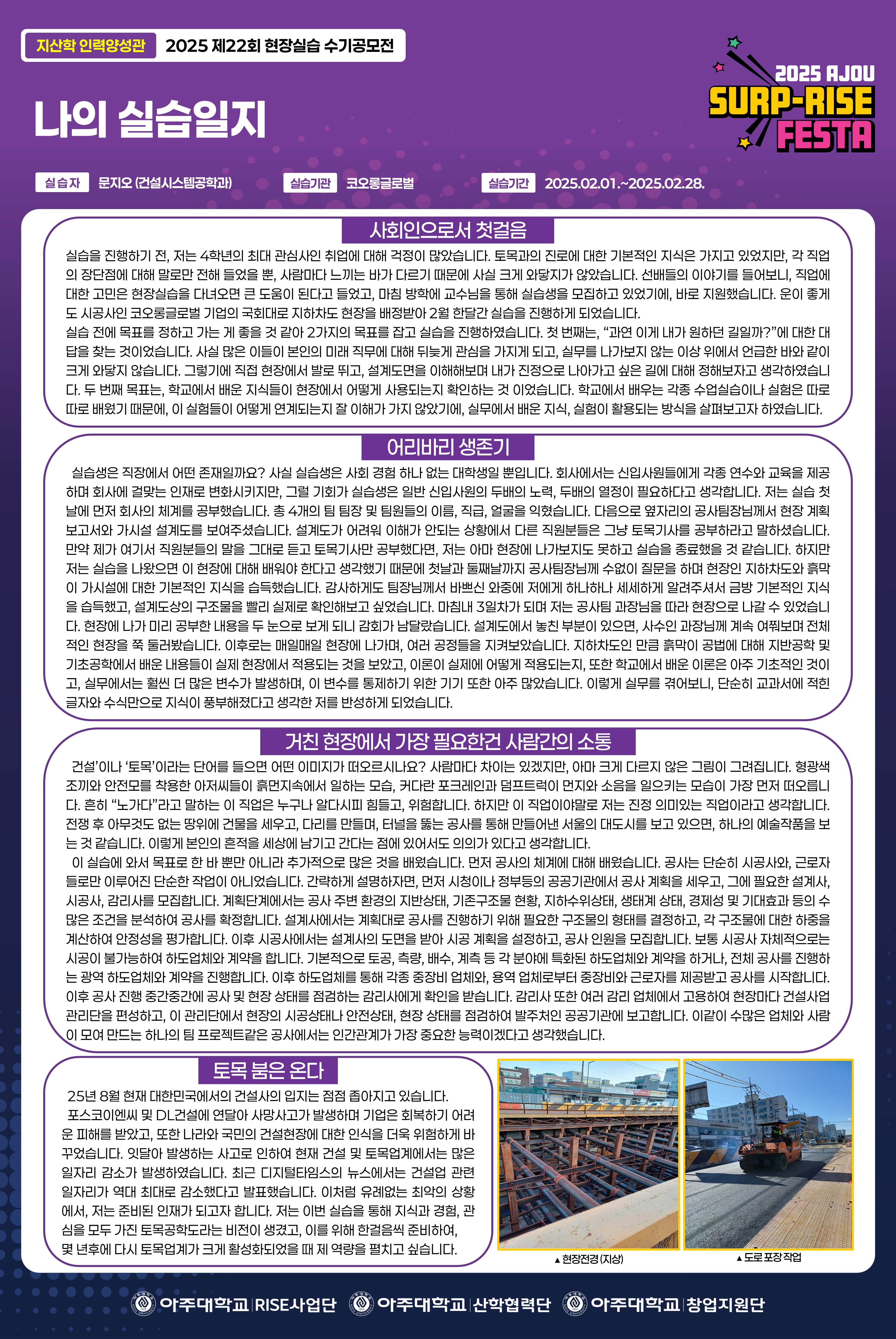 HOME ACOT 전시관 [현장실습] 2025 제 22회 현장실습 수기·영상공모전 [현장실습] 2025 제 22회 현장실습 수기·영상공모전 [수기] 나의 실습일지 좋아요좋아요 6개 목록